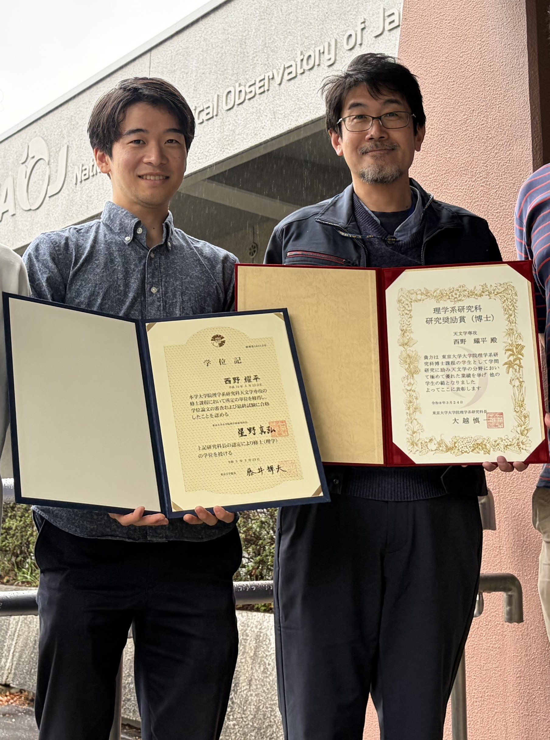 重力波プロジェクトに所属する西野耀平さん(東京大学大学院理学系研究科天文学専攻博士3年)が博士号を取得し、東京大学大学院理学系研究科研究奨励賞を受賞しました。おめでとうございます!